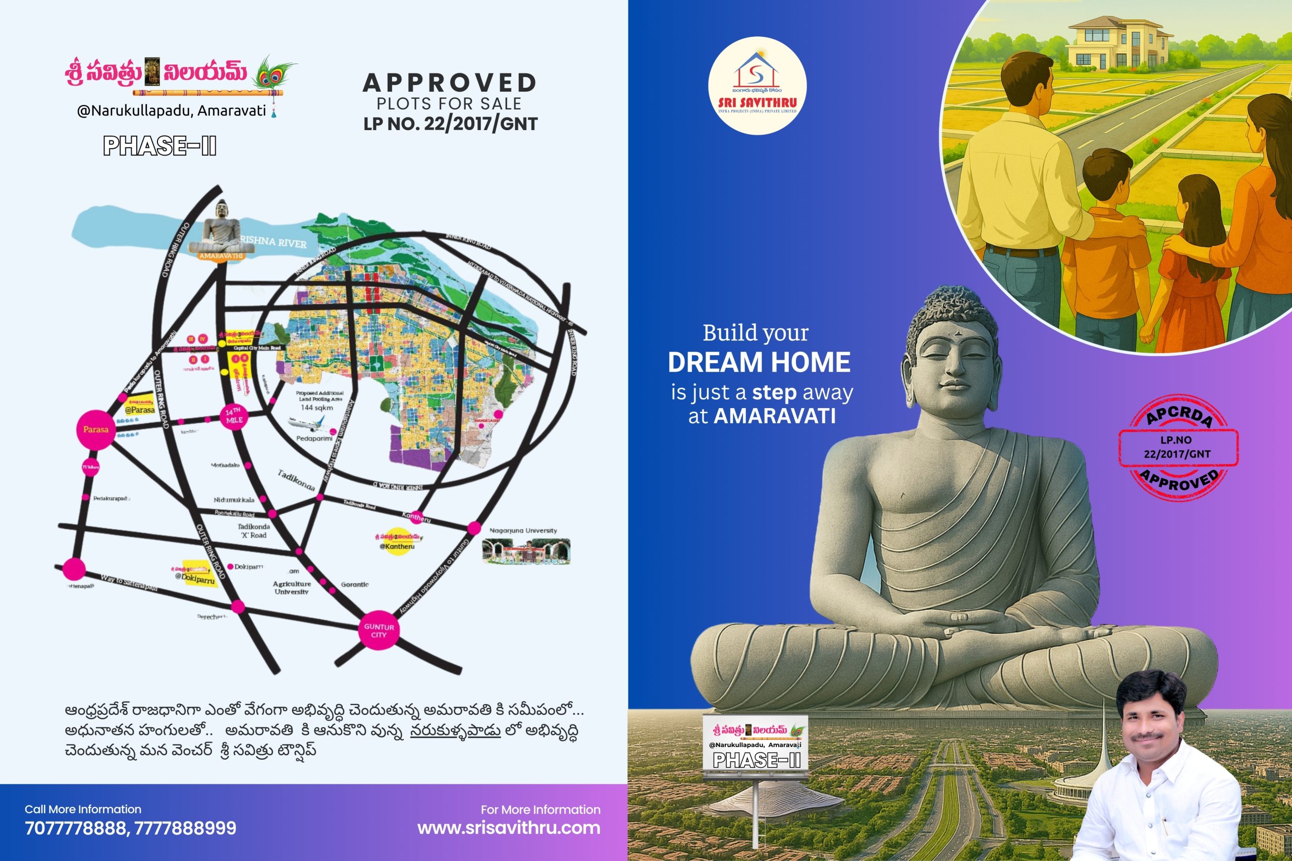 Invest in APCRDA-approved open plots (LP No. 22/2017/GNT) at Sri Savithru Nilayam Phase-2, Narakullapadu, Amaravati. Enjoy premium amenities like blacktop roads, Vaastu-compliant layout, parks, water connections, and more. Located near top universities, hospitals, and highways. Book your plot today!